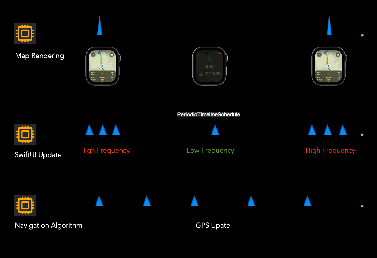 每次 GPS 的刷新会触发导航算法的判断,是否偏离路线或者要不要转弯,但这时候地图不一定会渲染,地图的磁贴也不会下载,地图的下载渲染仅在用户的抬腕时,当在后台或者亮度降低时高昂的 UI 操作都会是非常低频的。